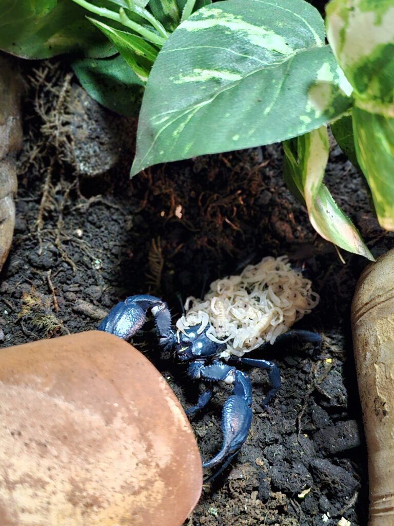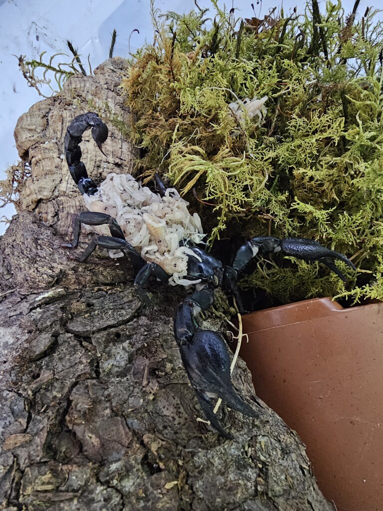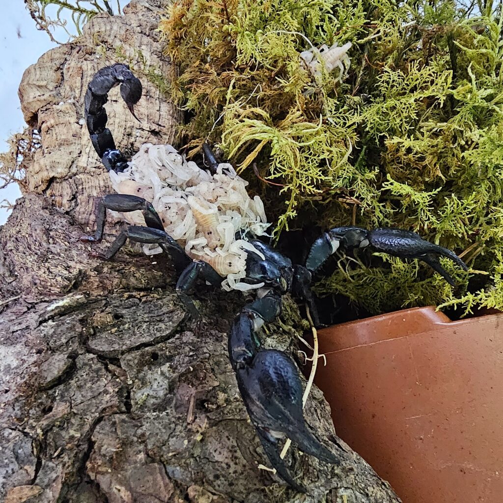 Naši prvi škorpijoni so kot mladiči prišli v Tropsko hišo iz živalskega vrta Ostrava na Češkem. Do danes so se večkrat levili, zamenjali staro ogrodje, in pridno rasli. Tokrat se ponovno razveseljujemo novega življenja – samica te vrste je namreč skotila leglo 18 mladičev. Ob rojstvu so mladiči svetli. Po rojstvu so zlezli na mamin hrbet, samica pa jih je tako prenašala naokrog in varovala. Ta dogodek predstavlja pomemben mejnik za našo ustanovo, saj gre za eno izmed uspešnih razmnožitev te vrste v umetnem okolju v Sloveniji. Mladi škorpijoni so rezultat skrbnega dela naših oskrbnikov, ki so staršema ustvarili optimalne pogoje, podobne tistim, ki jih ta vrsta potrebuje v tropskih gozdovih jugovzhodne Azije.